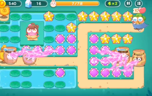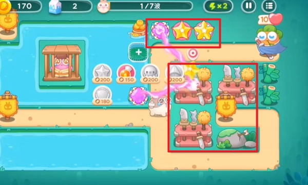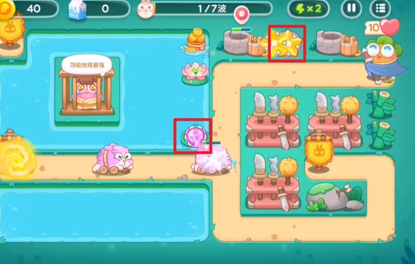 1、首先在右上角布置一个星星炮塔,使其投入使用以拆除道具。与此同时,在池塘里安置魔法球炮塔,专门用于击杀怪物。在前期阶段,这两个位置所放置的炮塔能够成功打掉旁边的大型道具,从而为后续的布局规划与战斗开展营造更为有利的条件。