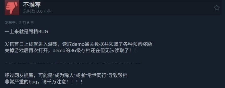 玩家们给出差评的主要原因集中在优化问题上。不少玩家反映,即便使用配置较高的设备,也会遇到掉帧、闪退等各类性能问题,更严重的是还存在毁档、无法读取Demo版存档等恶性bug。让人感到疑惑的是,这款游戏在Demo版本时运行状态良好,但到了正式版却出现了帧数大幅下降的情况。