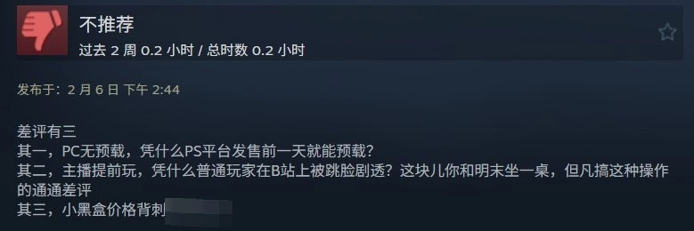让玩家感到愤怒的原因还涉及游戏之外的因素,比如PS5版本比PC版本更早解锁游玩、PC端无法提前下载游戏文件,以及游戏提前提供给主播试玩致使普通玩家被强行剧透等情况。
