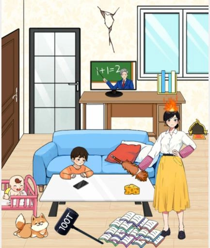 3、把厕所门往左滑动,点击大门,将作业拖到爸爸和老师那里。