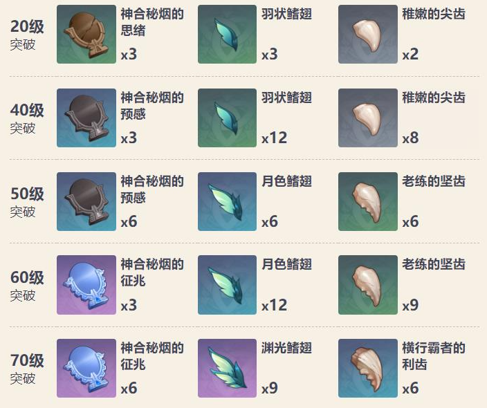 碎链的突破材料涵盖神合秘烟系列的各类思绪、预感、征兆与启示,还有羽状鳍翅、月色鳍翅、渊光鳍翅,以及稚嫩的尖齿、老练的坚齿、横行霸者的利齿。这些材料让碎链的突破过程更为充实,也使其整体属性得到了提升。