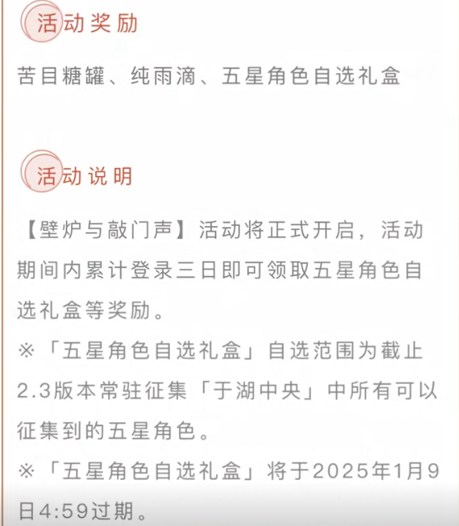 五星角色自选礼盒:可在指定范围内挑选一名五星角色,该范围涵盖截至2.3版本常驻征集「于湖中央」版本的全部五星角色。礼盒的有效期限至2025年1月9日4时59分。
