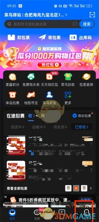 1. 第一步,打开菜鸟app,待进入首页后,能够切换至发现、消息、我的页面,此时我们点击右下角的【我的】。