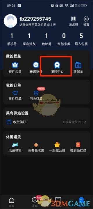 2、接下来在我的页面里,能够看到寄件会员、裹酱积分、服务中心、环保金权益,此时我们要点击【服务中心】。