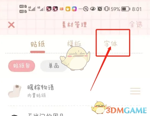 3、在素材管理页面,点击【字体】菜单,进入下一步。