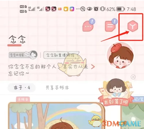 1. 轻点念念手帐页面右上角的【工具栏】图标。