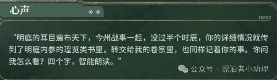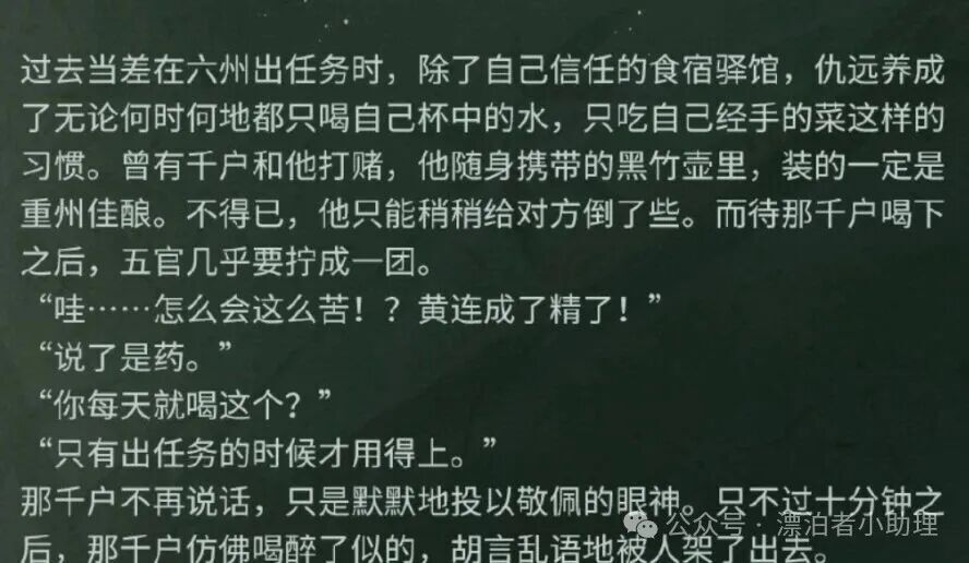 他总随身带着个竹壶,壶里盛着能催动心境与共鸣能力的药液。这药液滋味极苦,从前有位千户打赌说壶中是重州佳酿,尝了一口后便直叹“黄连成精”,没一会儿还醉倒了——也难怪他只在出任务的必要关头才肯饮用,这位江湖浪客的“专属饮品”,果然够独特。