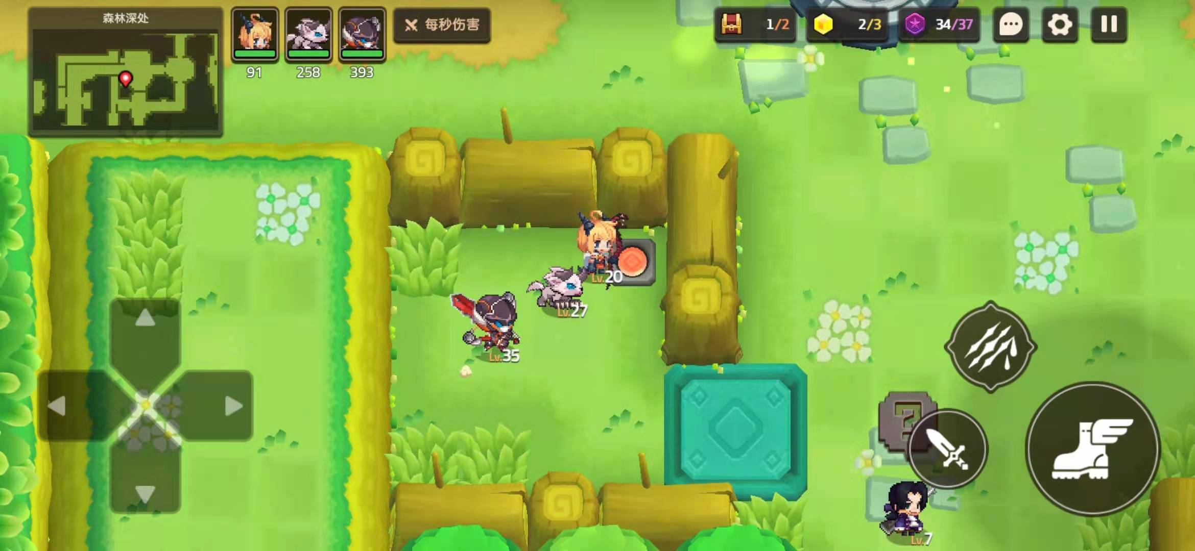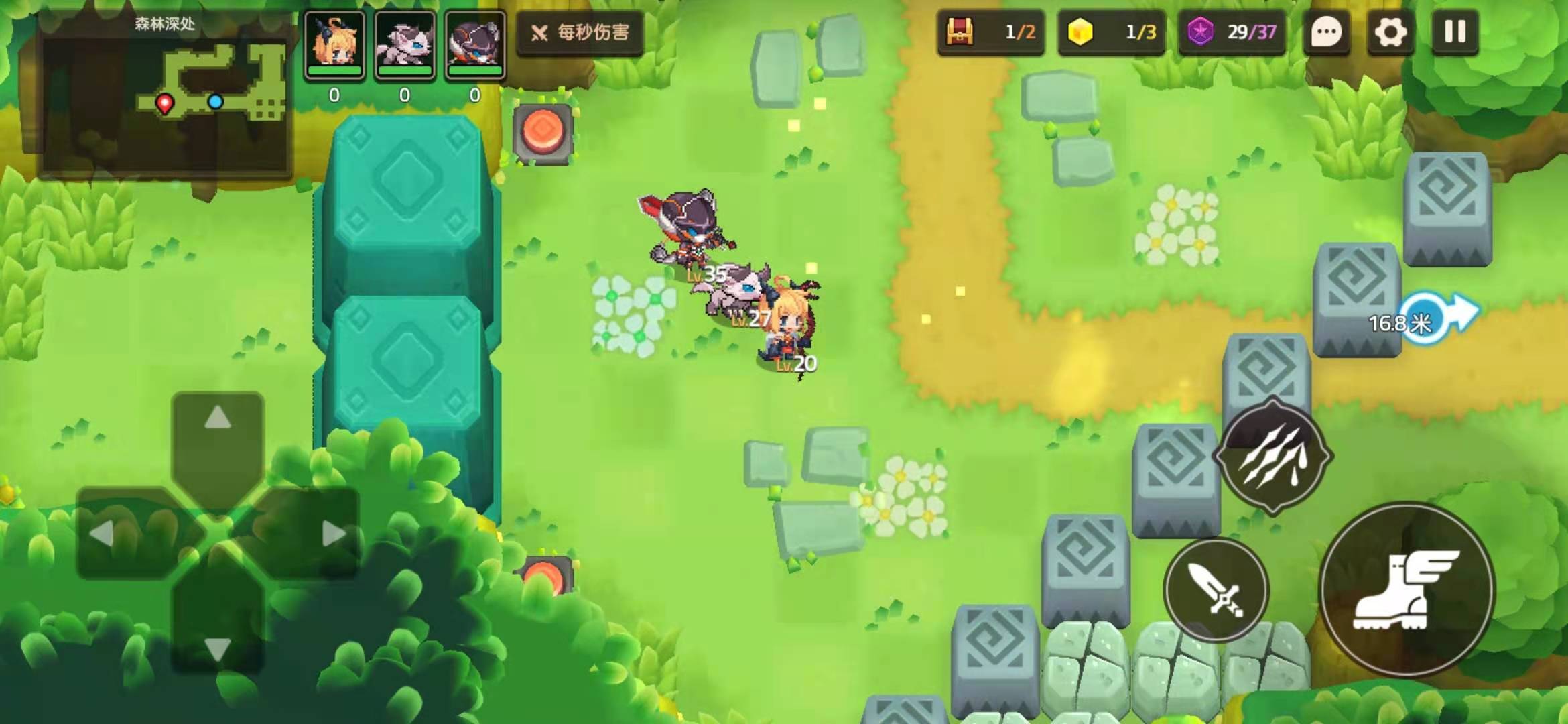 之后我们就能接着往前走,等走到一个广场,就可以点击进行补血。接着往下走,然后再往右边的森林走,就能进入一个岔道。在岔道里往上走,我们就能看到一个按钮,踩上去解锁之前的开关,之后走回去就能领取其他奖励。最后,我们按照地图方向继续前进就能通关了。