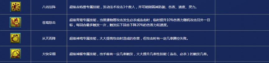 接下来看看那些超级神兽必带的特殊技能!首先是超级青鸾的必带技能苍鸾怒击,触发必杀或连击后会立即追加攻击一个指定目标,相当于攻宠能在一回合内攻击两个目标,这个技能还是挺受关注的。至于大快朵颐、八卦凶阵和突如其来这几个技能,大家平时见到的就比较少了!不过“浮云神马”这个技能是真的厉害,可以说是梦幻西游里迄今为止最值钱的兽决之一了吧!听说一本的价格能高达40万人民币!大家可以想象它有多珍贵!