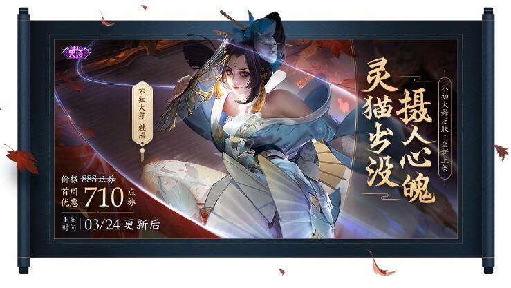 全新史诗级皮肤不知火舞-魅语,将于3月24日更新后在游戏内商城正式上架。在这款皮肤里,不知火舞化身狮猫形象登场,不仅拥有令人心动的迷人外表,更是一位格斗技艺精湛的女刺客,而且SNK原版游戏中为不知火舞配音的日本著名配音演员小清水亚美女士,也为这款皮肤倾情献声。