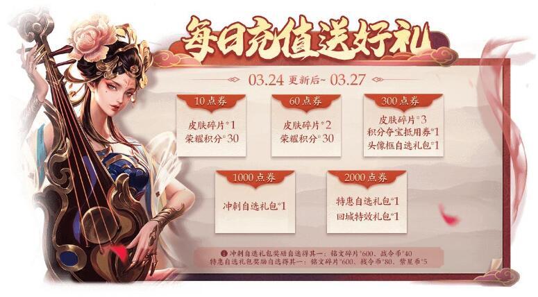 活动期间,每日充值2000点券额外赠送:特惠自选礼包*1+回城特效礼包*1+冲刺自选礼包*1+头像框自选礼包*1+积分夺宝抵用券*1+皮肤碎片*6+荣耀积分*60
