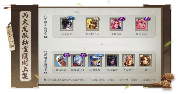【超值皮肤秘宝】福利来啦!购买红蓝对决(1日)即可额外随机获取以下奖励中的一项:夏侯惇-乘风破浪、嬴政-暗夜贵公子、孙尚香-沉稳之力、司马懿-魇语军师、铠-龙域领主、瑶-森、20点荣耀积分、1张新品皮肤抽奖券或2个皮肤碎片。