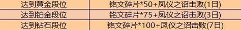 峡谷春风好礼送,赛末冲刺达到指定段位可领取铭文碎片+凤仪之诏击败特效(期限)。