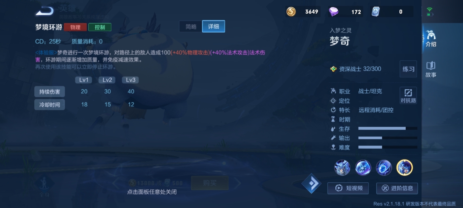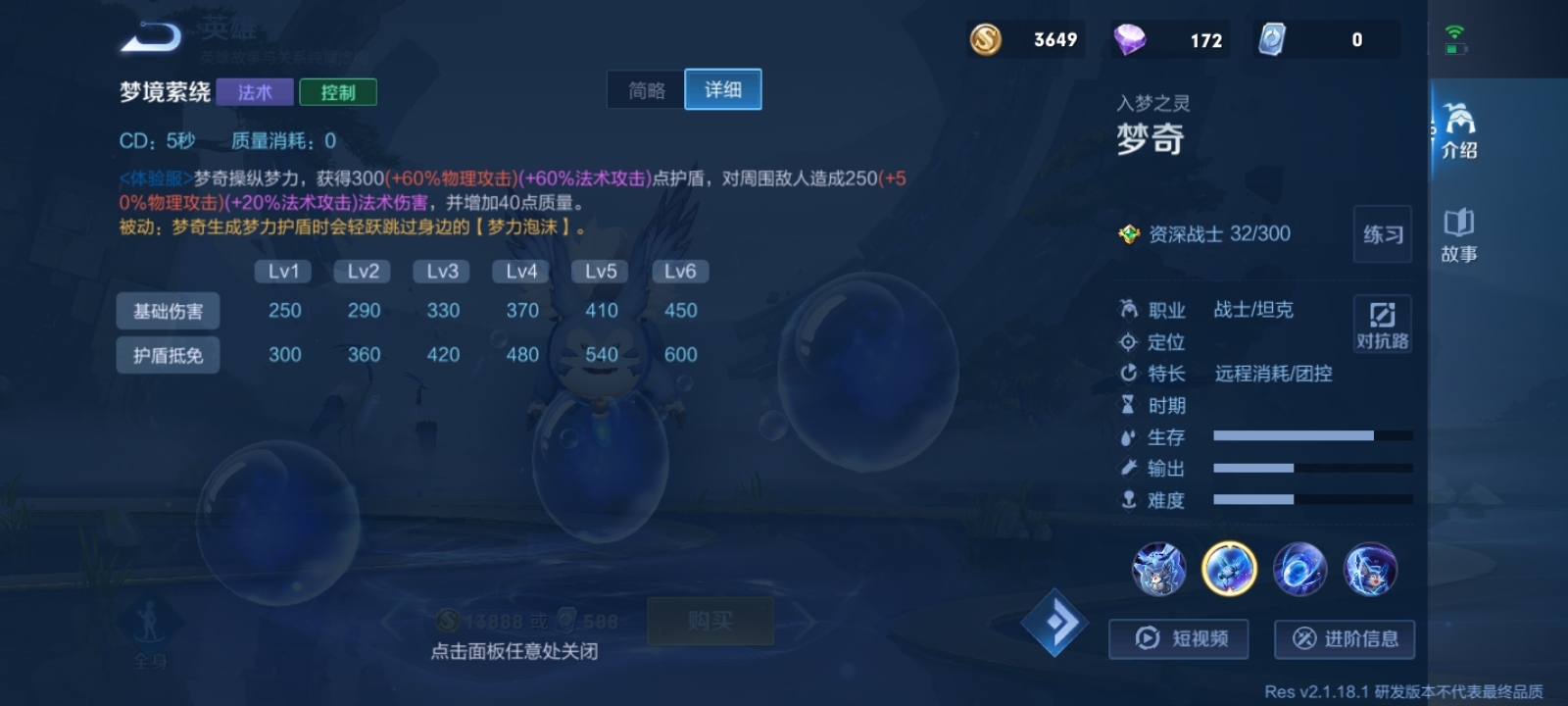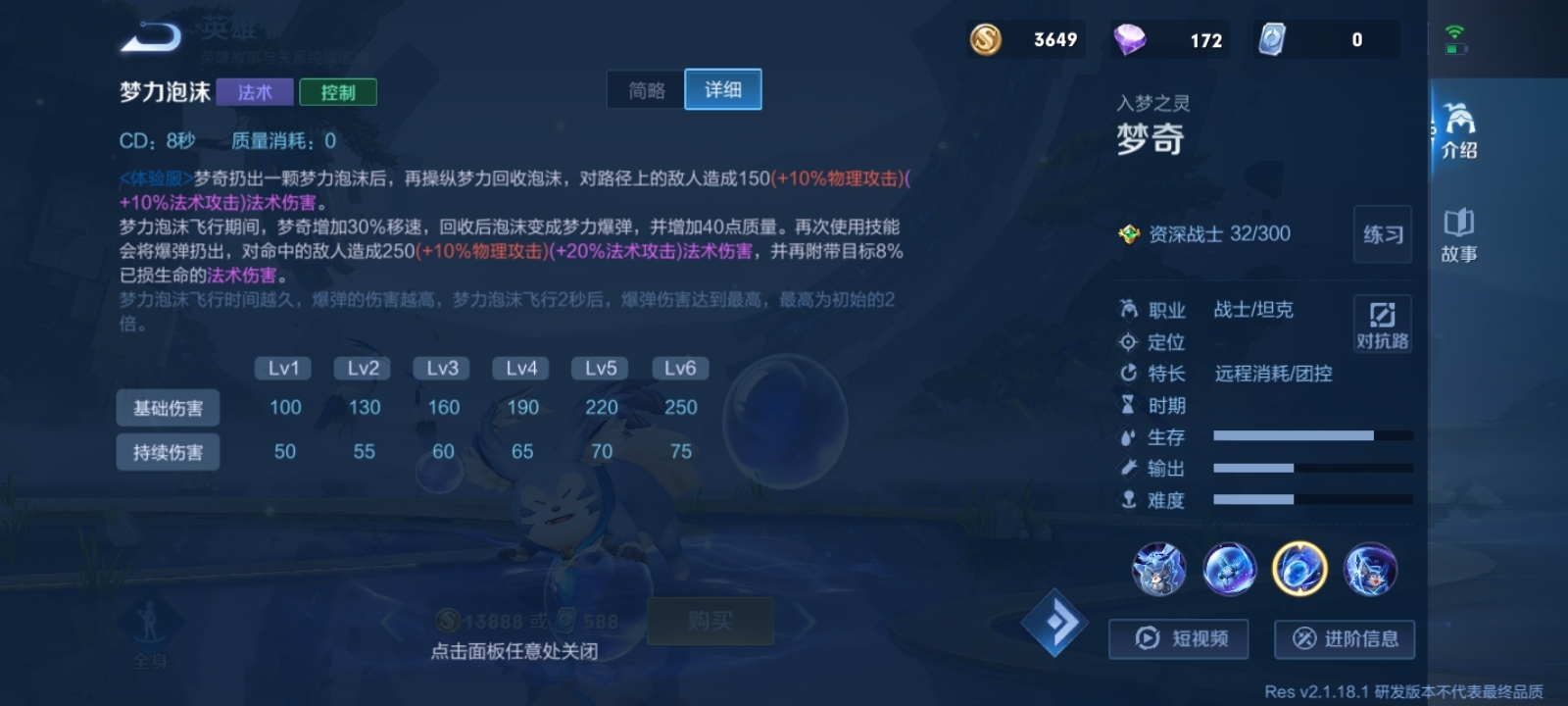 体验服梦奇的大招和正式服相比差异巨大。正式服梦奇的大招核心作用是进场打控制,体验服的则更偏向逃跑用途,尽管也能造成些许伤害,但即便是满级法装状态下,法术伤害也才1000点左右。