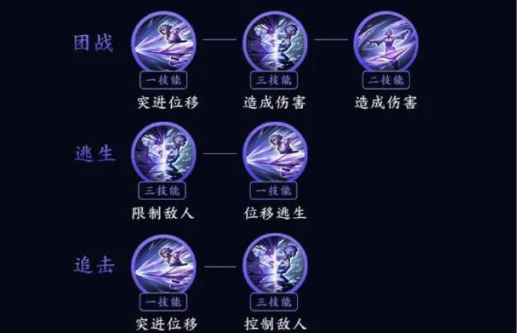 在团战里,一技能的主要作用是突进与位移,接着借助另外两个技能打伤害。释放三技能召唤分身之后,一和二技能的输出会翻倍;逃生时,用三技能限制敌人的移动,再配合一技能切换场上位置就能顺利脱身。