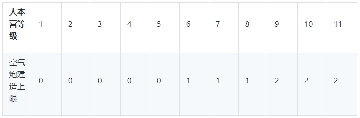 1、不同等级的大本营对应的空气炮可建造数量上限: