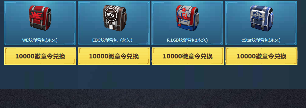 另外还有些物品得用一万点徽章令才能兑换,都是些背包,分别对应WE、EDG、LGD和Estar这类不同的游戏队伍。要是你是其中某支队伍的粉丝,就能挑一个自己最喜欢的背包来用,而且颜色还能自选,完全不用怕撞包。