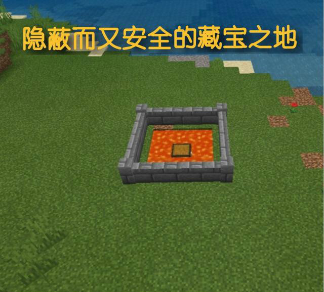 第七种方法是打造藏宝之地。岩浆虽然破坏力极强,能烧死生物,还会烧毁不少木质物品,但用来藏宝却十分合适。因为有些物品是岩浆无法销毁的,其中最具代表性的就是箱子——尽管箱子是木质的,却能在岩浆里完好存在。所以我们可以把贵重物品放进箱子,再将箱子置于岩浆池中,这样就能形成一个隐蔽且安全的藏宝之处。