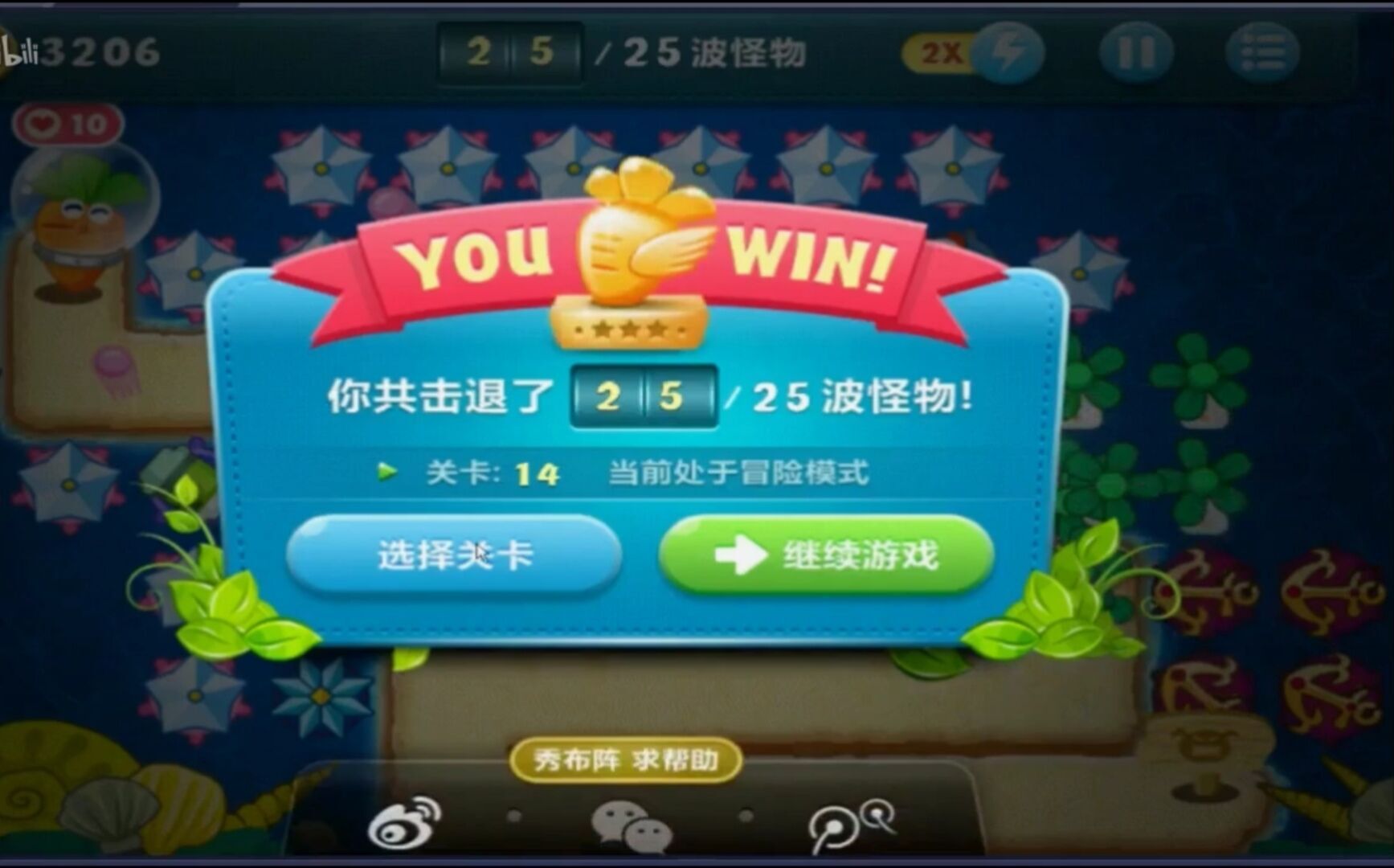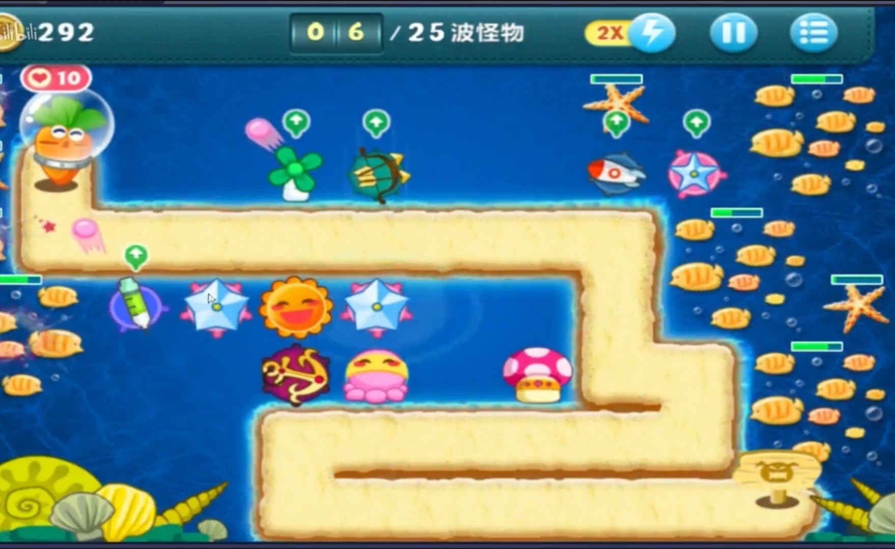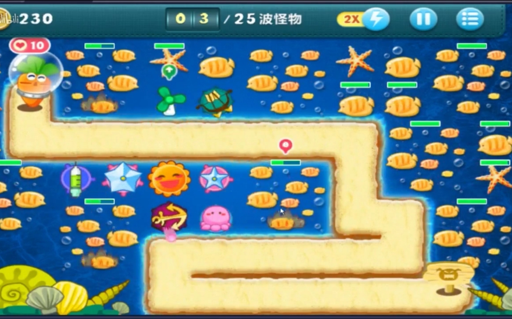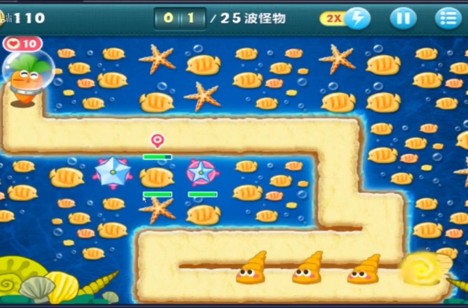 深海主题第十四关:本关共有25波怪物,路程不算长,最后几波怪的血量较厚、速度较快,但整体难度中等。这一关的可选武器均为减速类,没有攻击性强的道具,所以选对减速道具十分关键。游戏开始时玩家拥有1050金币,需要合理利用这笔钱搭建第一座炮塔。