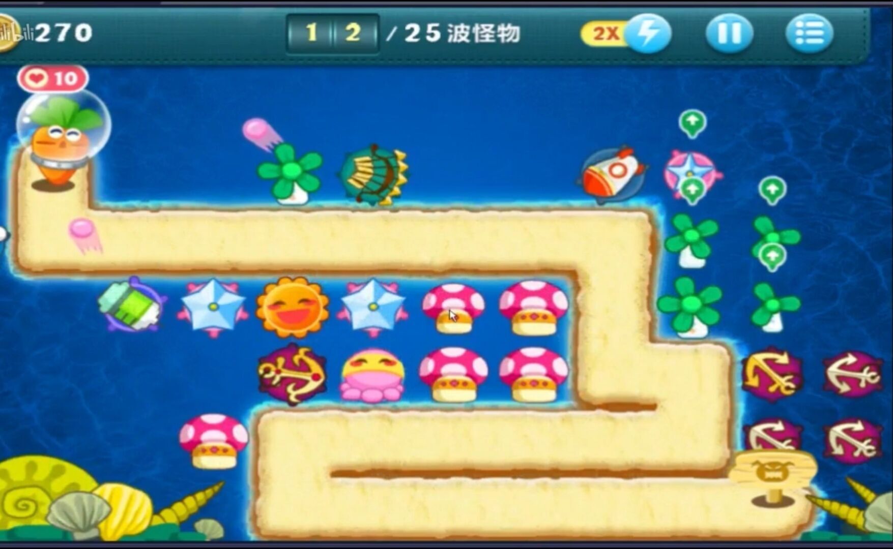 第七步把太阳花道具和船锚道具都铲除,替换成减速星星道具;由于清理到最后一波时金币需求已经不大,还能把蘑菇道具也换成减速星星。