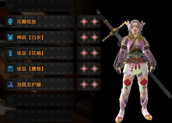 一、侍奉神樱的巫女套装:花瓣绽放、神止白衣、依巫花袖、依巫腰卷搭配泡狐龙护腿,这套紫色系的装束十分美观。