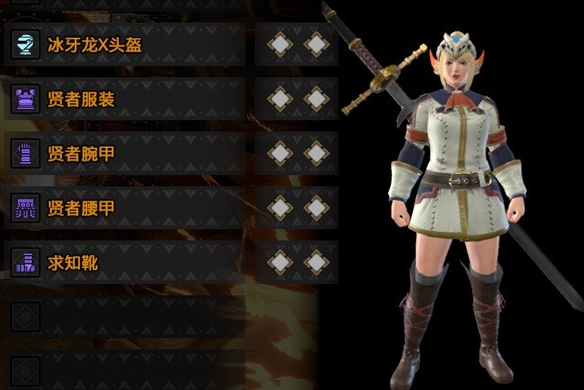 八、极简骑士:冰牙龙X头盔、贤者服饰、贤者腕甲、贤者腰带、求知靴,像古代的精灵。