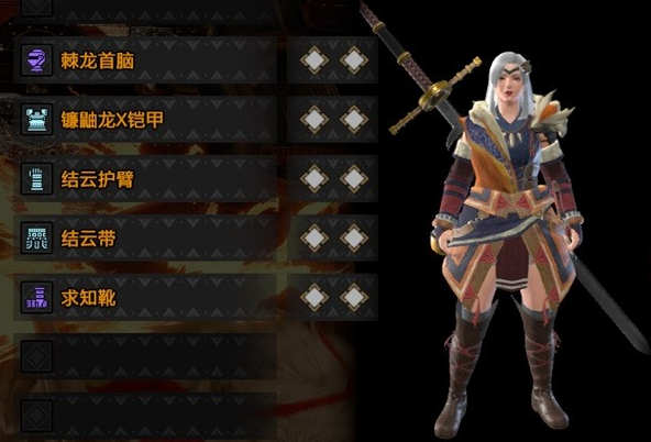 三、选择疾风的猎人:棘龙首脑、镰鼬龙X铠甲、结云护臂、结云带、求知靴,这套狩猎人的搭配透着一股野性的美感。