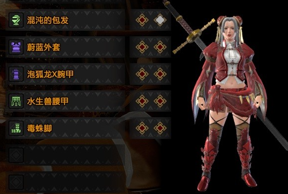 六、烈焰:混沌的包法、蔚蓝外套、泡狐龙X腕甲、水生兽腰甲、毒蛛脚,全身都是大红色的配色。