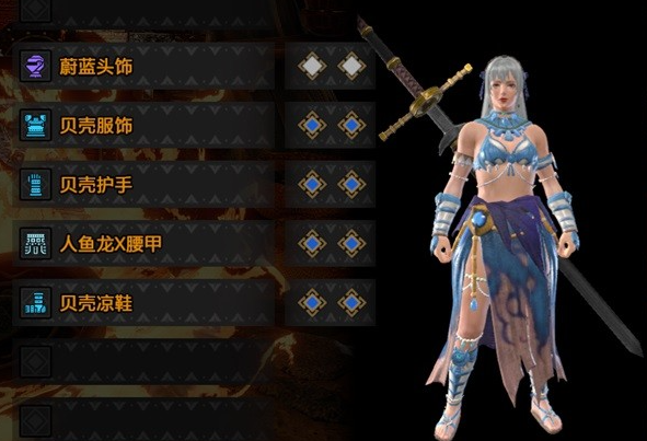 二、凝望深海的女妖:头戴蔚蓝头饰,身着贝壳服饰与贝壳护手,腰系人鱼龙X腰带,脚蹬贝壳凉鞋,这套纯蓝色的装备让角色宛如人鱼般灵动。