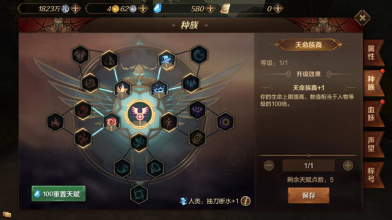 在种族界面,你能查看当前拥有的各项能力,利用天赋点数对这些能力进行升级操作,同时还能直观看到能力升级前后的对比情况。此外,消耗100钻石即可重置天赋能力。