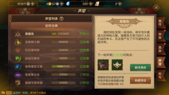 在声望页面,你能看到当前的声望列表,当前角色通过完成主线与支线任务所获取的各类声望都会展示在这里。此外,你还可以点击前往商店按钮购买各种技能,也能通过捐赠物资来提升声望,且当天的可捐赠次数为3次。