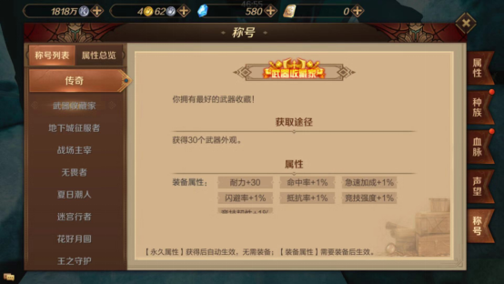 在称号界面,能看到完整的称号名录,每个称号都会展示其简介、获取方式,以及装备该称号后可获得的属性加成。