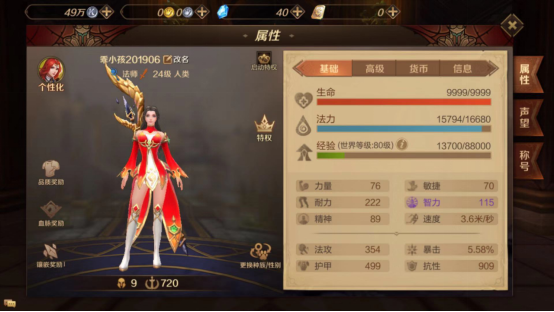 选择角色后进入角色详情页面,这里能看到涵盖属性、种族、血脉、声望、称号等多个板块的内容。属性板块包含当前角色的基本信息、基础属性、物理攻击、防御属性以及强化属性;货币板块则显示用户当前的体力与活力数值。此外,页面上还能查看当前用户所获得的血脉奖励和镶嵌奖励。