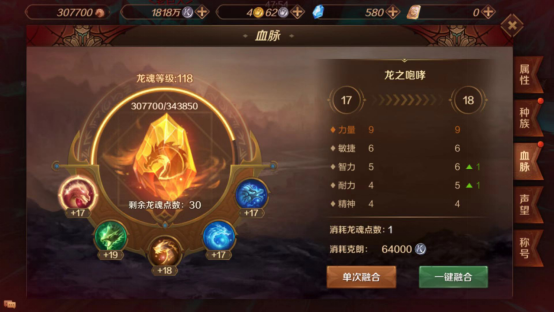 在血脉界面,你可以利用龙魂点数来提升当前已有的能力,让角色变得更强大。界面右侧会清晰展示升级前后的属性对比。要是你拥有较多的龙魂点数,就能通过“一键融合”按钮来自动分配点数;而如果点数相对较少,则可以使用“单次融合”按钮,逐个对各项能力进行升级。