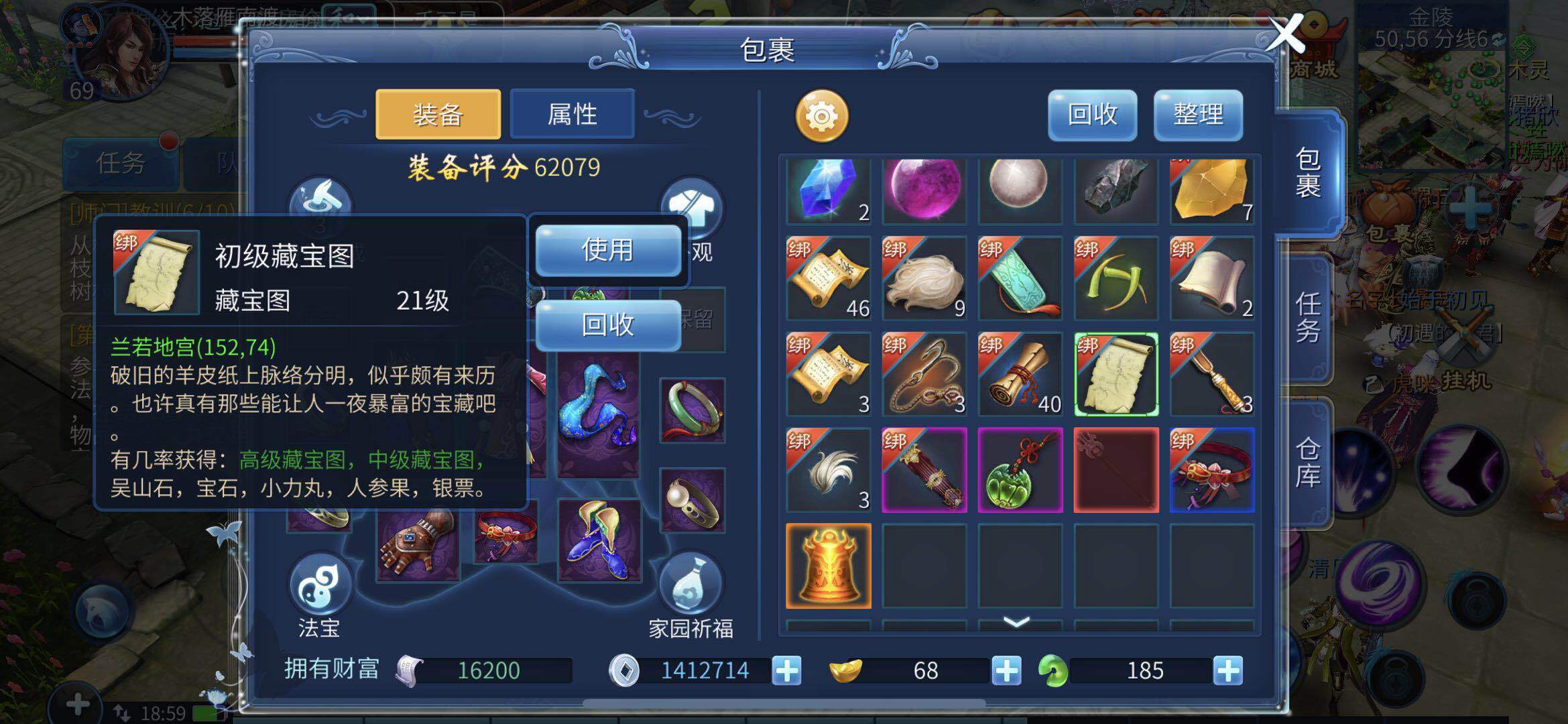 这是最常见且安全性极高的挖宝方式之一,玩家独自就能完成。藏宝图有初级、中级和黄金三种类型,初级藏宝图的奖励最为微薄,或许是几千银两,抑或是等级不超过三级的吴山石;中级藏宝图的奖励会更丰厚些;至于黄金藏宝图,则有机会挖出江山社稷图的组成部分这类较为稀有的物资。