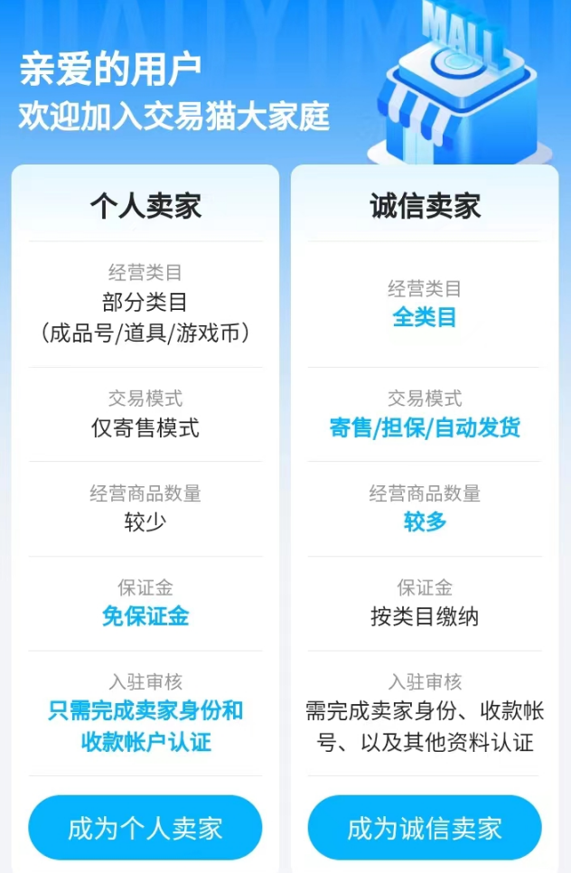 另外,平台考虑到部分玩家打算脱坑卖号,所以也为大家提供了卖家身份的申请通道。要是各位出售的游戏账号数量不多,小编优先建议大家选择个人卖家身份。这个身份的申请流程简单,而且不需要缴纳押金就能获得卖号权限。