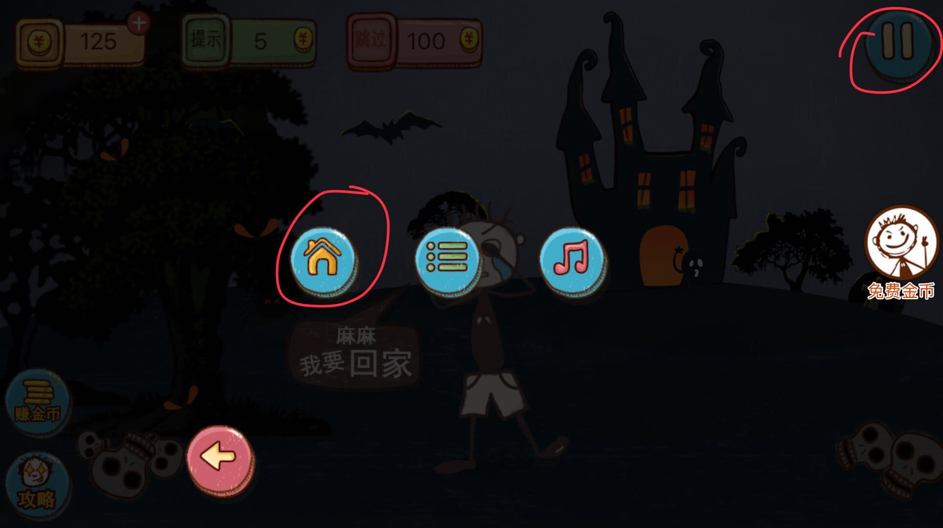 2、首先点击右上角的暂停按钮,此时会弹出三个图标,选择第一个带有房子标识的图标,即可完成关卡。