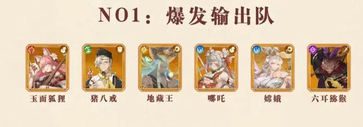 这一阵容由玉面狐狸、猪八戒、哪吒和嫦娥等角色组成,也被称为爆发输出队,拥有最强级别的战斗能力,能够在短时间内对敌人造成大幅攻击伤害。