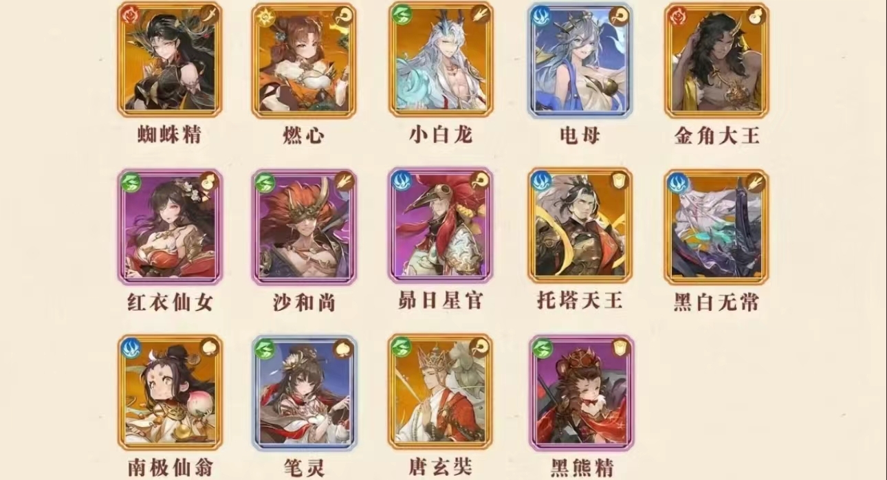 T1:T1在英雄强度上相较于上一级别稍弱,但依旧是游戏里强度排名靠前的英雄,主要包括蜘蛛精、小白龙、金角大王、托塔天王、南极仙翁、沙和尚、黑白无常和笔等。