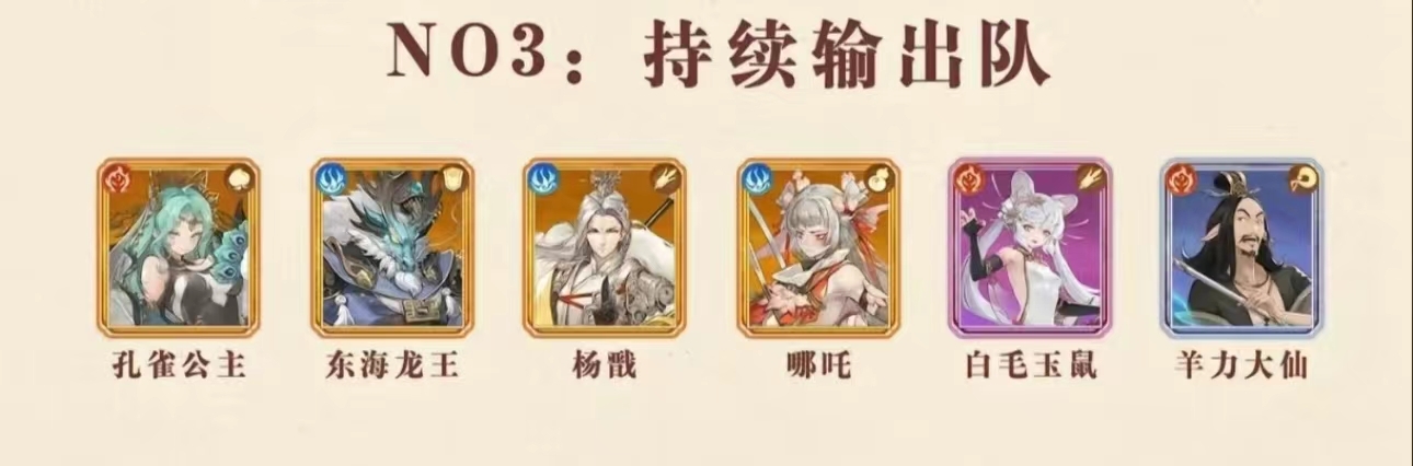 这一阵容的强度相比前面的阵容要弱一些,属于偏向持久战的类型,主要由孔雀公主、哪吒、羊力大仙和杨戬等人组成,依靠长时间的持续输出获取胜利。