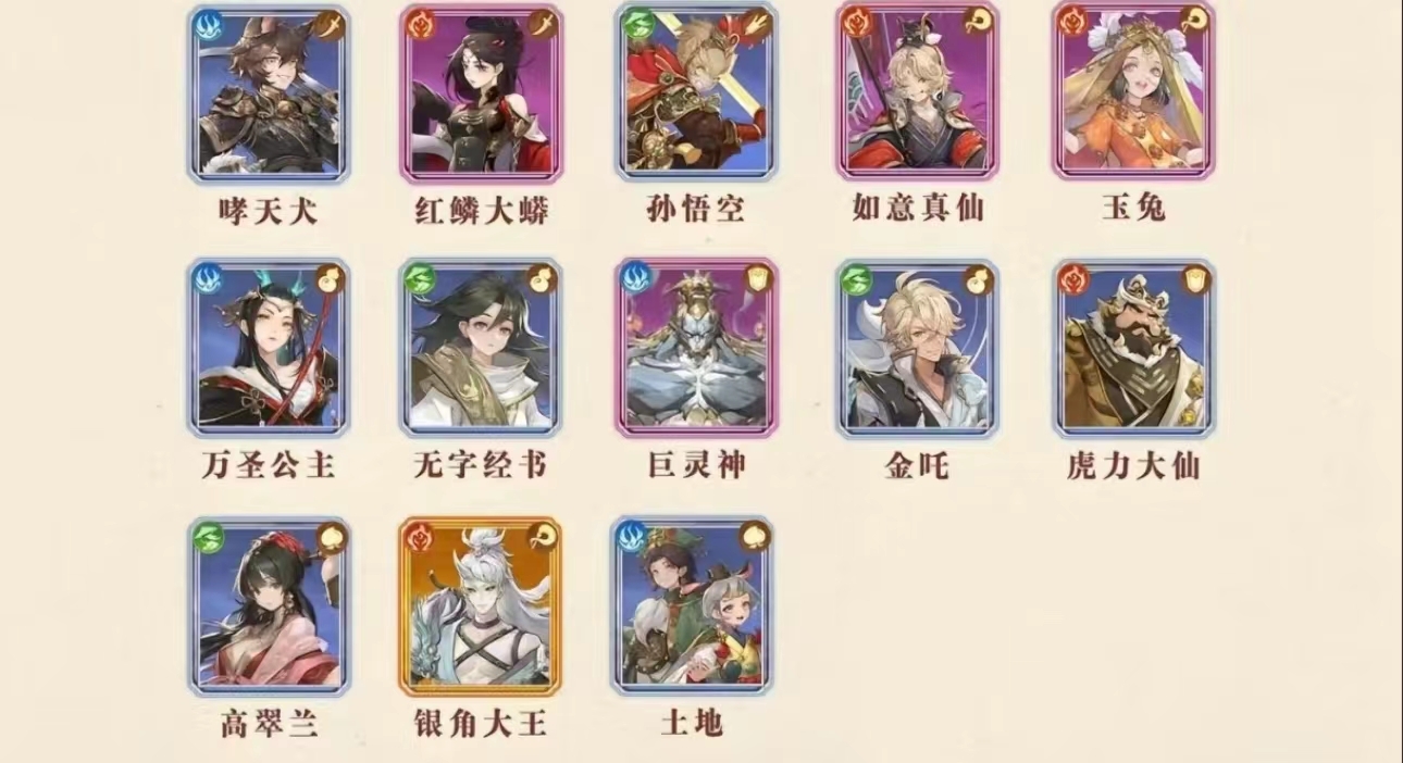 T2:这一级别在所有英雄角色中强度处于最弱梯队,包含玉兔、土地、高翠兰、银角大王、如意真仙、虎力大仙以及无字金书等角色。