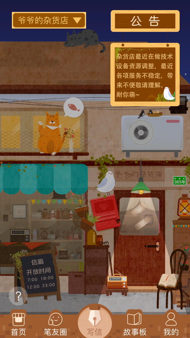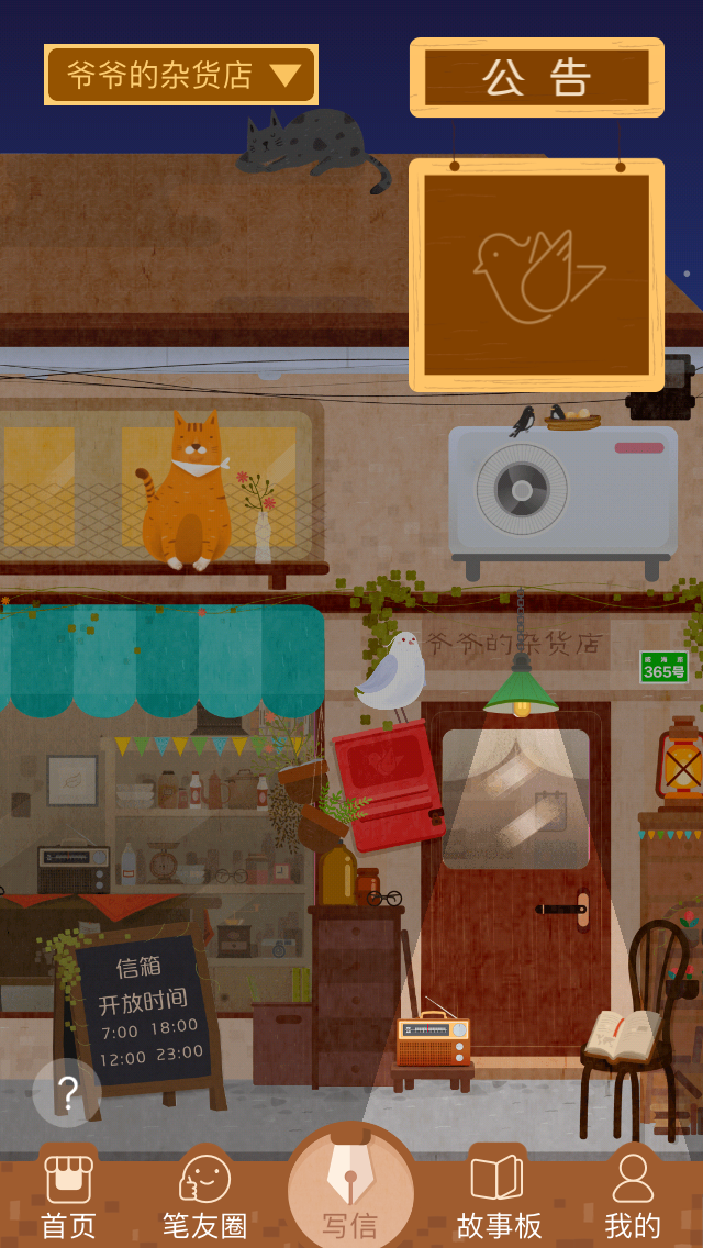 进入这款应用后,就能看到这样的界面——它设有白天和夜晚两种模式。每当夜晚降临,界面会自动调暗,为你的双眼开启温柔护航,从中能感受到游戏设计的用心与体贴。界面画面十分唯美,还可以左右拖动;正中间有个邮箱,上面标注着寄信时间,别忘了对面的老爷爷也需要休息呢。