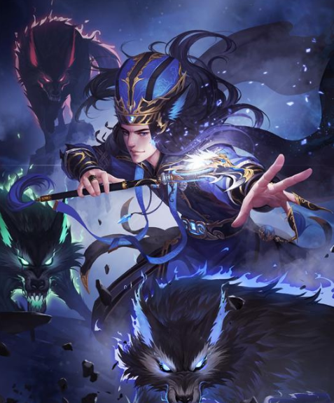 男主角神司马懿位于照片中央,身后有三匹狼,背景是辽阔的星空。他侧身对着我们,右手握着三团磷火,左手轻抚其中一匹狼的脑袋。
