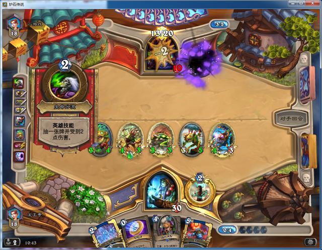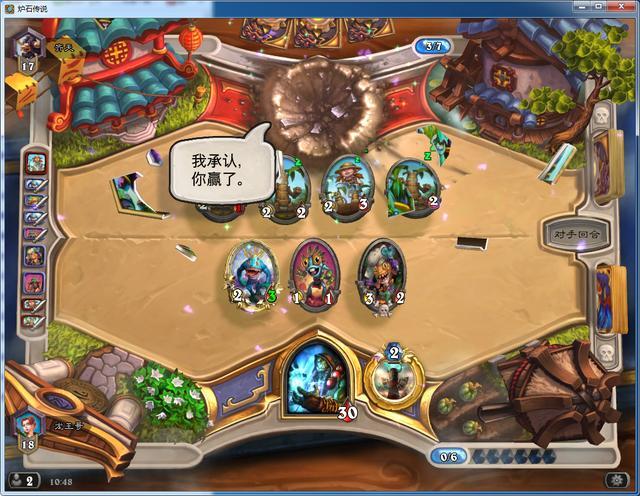 我遇到的德鲁伊在5费回合就完成了关键操作,同一回合我也打出了那波“忠犬攻势”,直接把对手打到只剩2血。到了第6回合,对方就彻底陷入被动,只能加个嘲讽特效勉强撑住,但最终还是被我突破了防线。