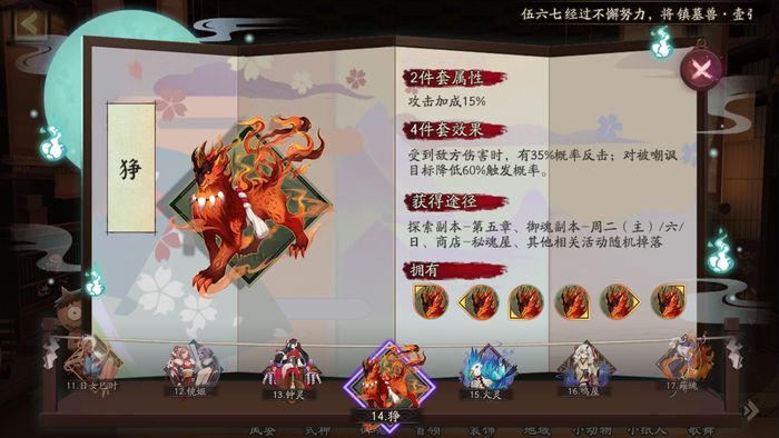 考虑到红叶的被动技能能提升50%间接伤害,这时搭配2件套土蜘蛛就很合适,因为它最多可叠加30%间接伤害,两者加成叠加后能达到45%,能增强整体输出强度。至于4件套,则建议选用狂骨,毕竟它能带来最高的增伤效果,最多8火时可提升64%的输出伤害。