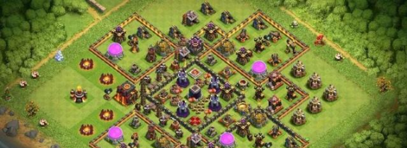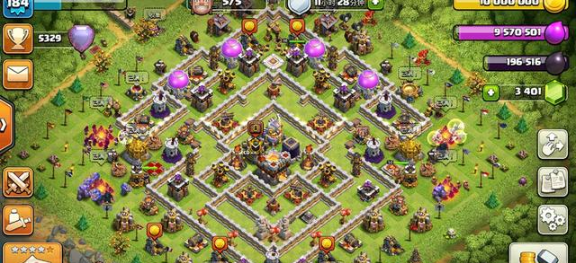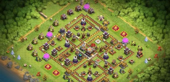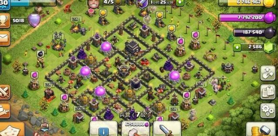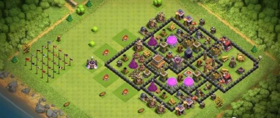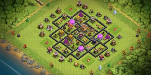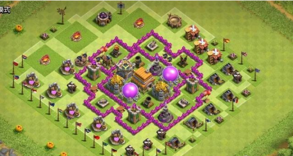 这个阵型是八本毕业阵,八本阶段能用,护资源和防御效果都不错,用来冲杯也合适,不过打部落战的话表现就不好说了。