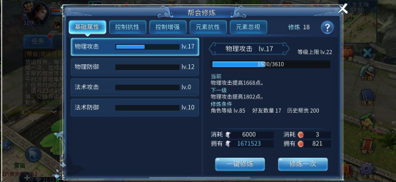 玩家加入帮会之后便能开启修炼升级,每提升一级修炼,就要消耗两点帮贡,同时还需要花费一定的帮贡和大量的银票。