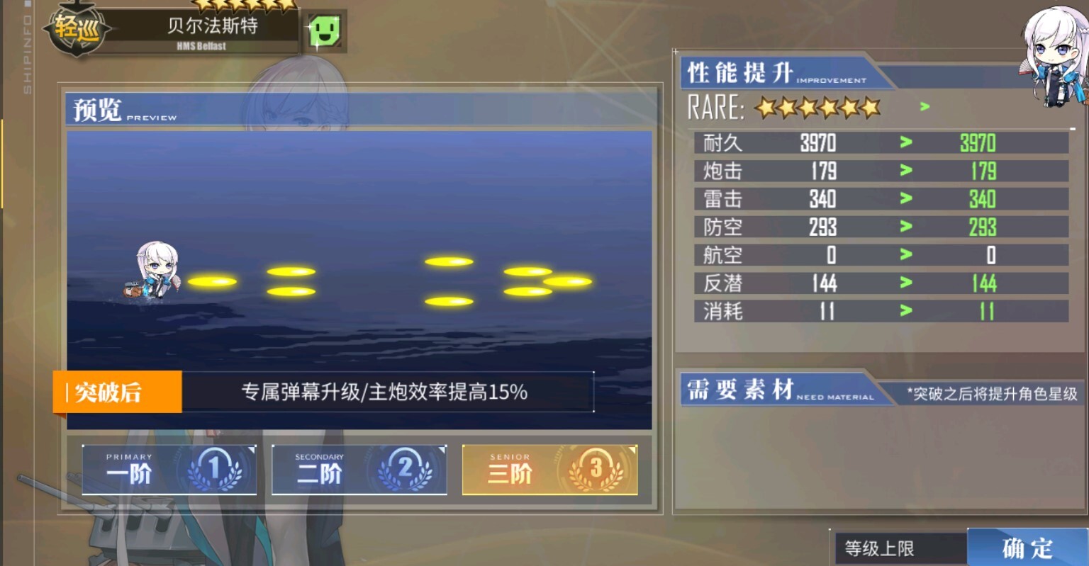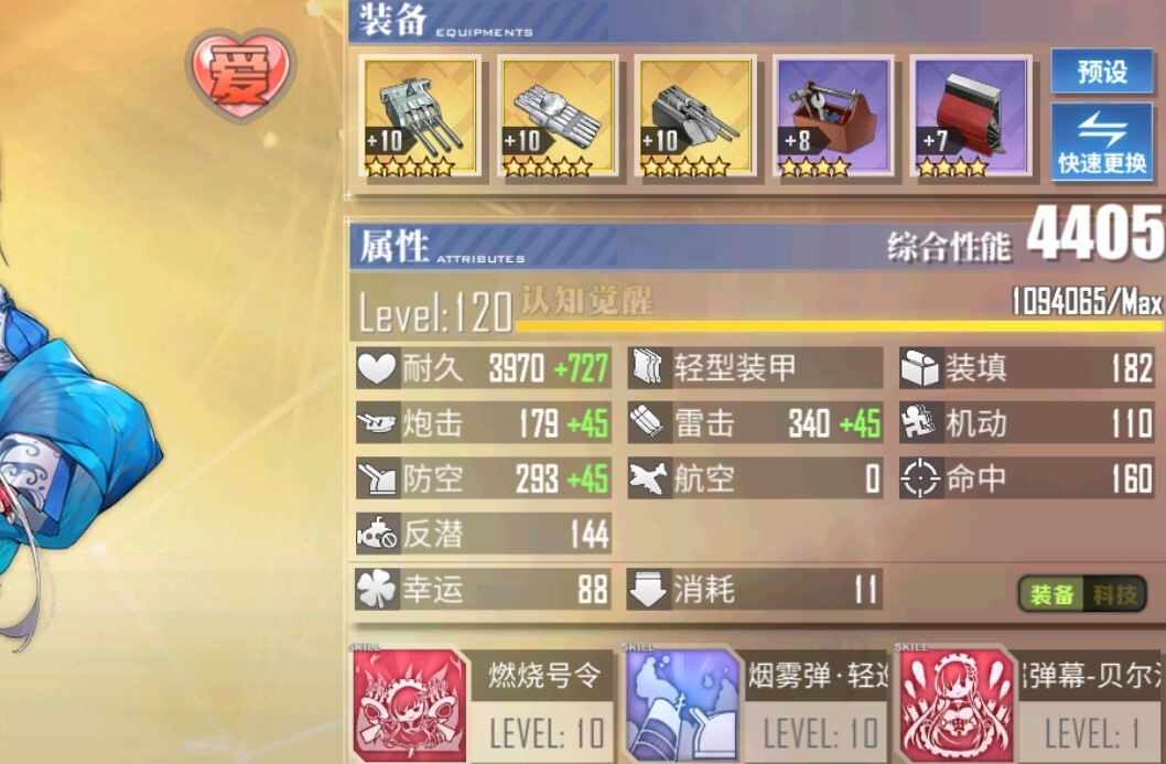 贝法的属性表现比较均衡,在轻巡洋舰里属于生存能力较强的类型,它最突出的特点是拥有10秒持续时间的烟雾弹,美中不足的是后续烟雾需要概率触发。不过凭借着高幸运属性和独特烟雾弹的双重优势,它在道中作战时可以胜任1号位和3号位的位置。其1技能能为高爆弹提供25%的伤害加成,这个增幅力度不算小,再结合本身不错的炮击与雷击能力,贝法在输出层面的表现其实并不弱,只是还没达到一流输出水准而已。