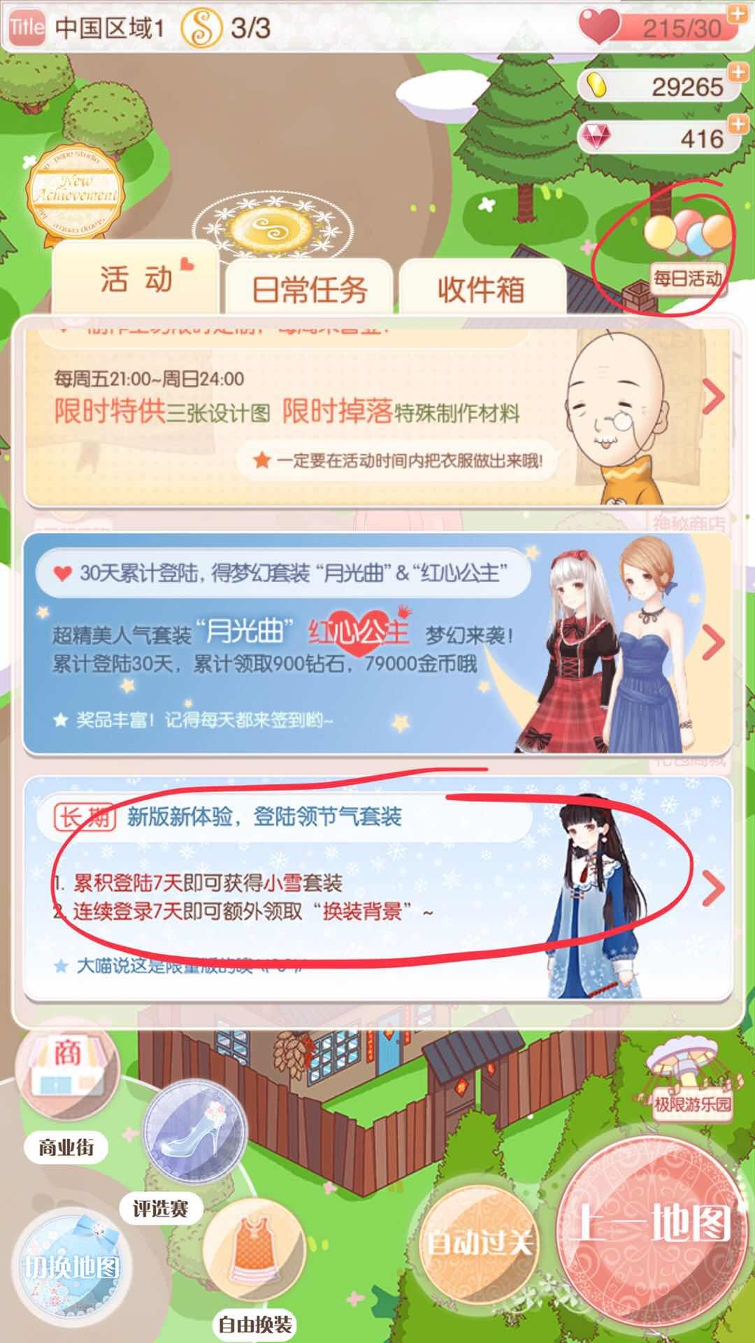 官方的活动,例如右侧“每日活动”中的长期活动,只需累计登录7天,即可获得“小雪套装”。