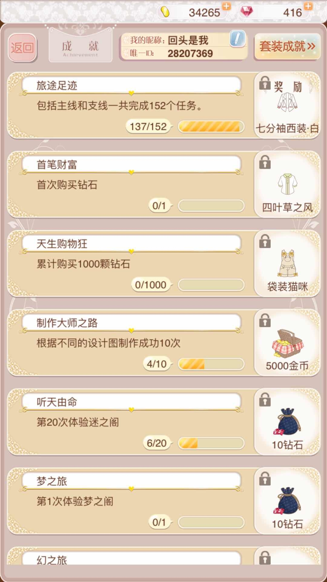 最后一个途径是通过完成成就获取奖励,成就的种类十分丰富,奖励内容包括金币、钻石,当然也少不了各种好看的衣服!!